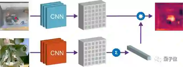 谷歌使用完全卷积架构和简单的度量学习算法,来实现这种等式关系。 在训练时,将抓取前图像和抓取后图像放入密度空间特征图中,用“抓取前”和“抓取后”向量之间的差异表示一组对象。