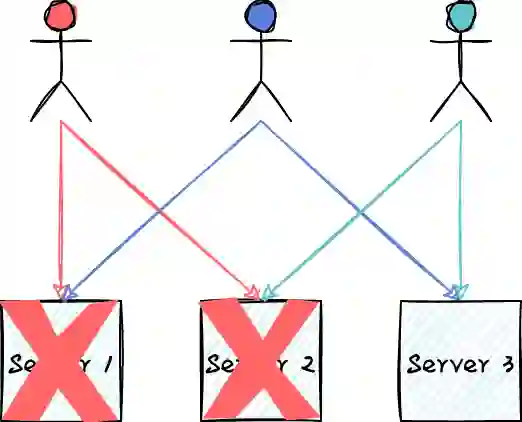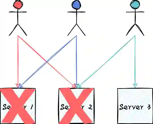 接下来,让我们调整下用户负载的映射方式。如下图所示,每个用户的负载均匀的映射到两台服务器上。不但负载更加均衡,更棒的是,即使两台服务器宕机,除红色之外的用户负载都不受影响。如果我们把分区的大小设为2,那么从3台服务器中选择2台服务器的组合方式有 C_{3}^{2}=3 种,即3种可能的分区方式。通过随机算法,我们将负载均匀的映射到分区上,那么任意一个分区不可服务,则最多影响1/3的负载。假设我们有100台服务器,分区的大小仍然是2,那么分区的方式有C_{100}{2}=4950种,单个分区不可用只会影响1/4950=0.2%的负载。随着服务器的增多,随机分区的效果越明显。对负载随机分区是一个非常简洁却强大的模式,在保障多租系统的可用性中起到了关键的作用。