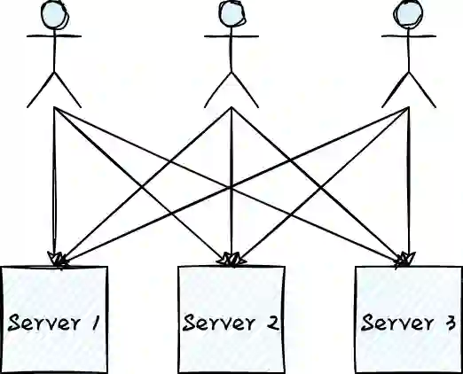 在一个多租环境中,防止“破坏者”对系统造成灾难性的破坏是系统设计的最大挑战。破坏者可能是被 DDoS 攻击的用户,或者在某些 corner case 下正好触发了系统 bug 的负载。下图展示了一种非常流行的架构,所有用户的流量以 round-robin 的方式均匀的发送给多台服务器。当所有用户的流量符合预期时,系统工作得很好,每台服务器的负载均匀,而且部分服务器宕机也不影响整体服务的可用性。但当出现“破坏者”后,系统的可用性将出现很大的风险。