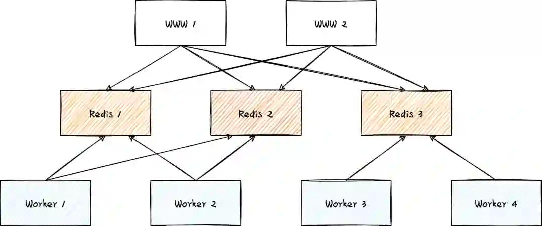 公司的异步任务处理系统架构。Worker 节点只和部分 Redis 实例相连。这解决了 worker 节点大规模扩展的能力,但是增加了调度和负载均衡的复杂度。