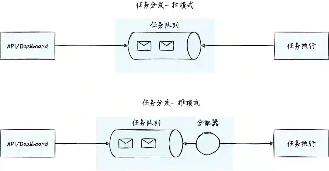 任务分发的架构可分为拉模式和推模式。拉模式通过任务队列分发任务。执行任务的实例主动从任务队列中拉取任务,处理完毕后再拉取新任务。相对于拉模式,推模式增加了一个分配器的角色。分配器从任务队列中读取任务,进行调度,推送给合适的任务执行实例。