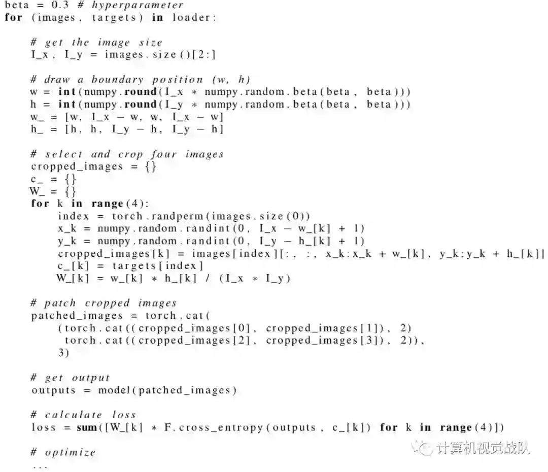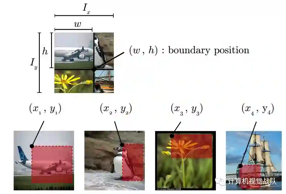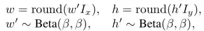 从训练集中随机选择了四个图像k∈{1,2,3,4},并在左上角、右上角、左下角和右下角区域对它们进行了修补。Ix和Iy分别表示原始训练图像的宽度和高度。(w,h)是给出每幅裁剪图像的大小和位置的边界位置。从Beta分布中选择每个训练步骤中的边界位置(w,h),如下所示。