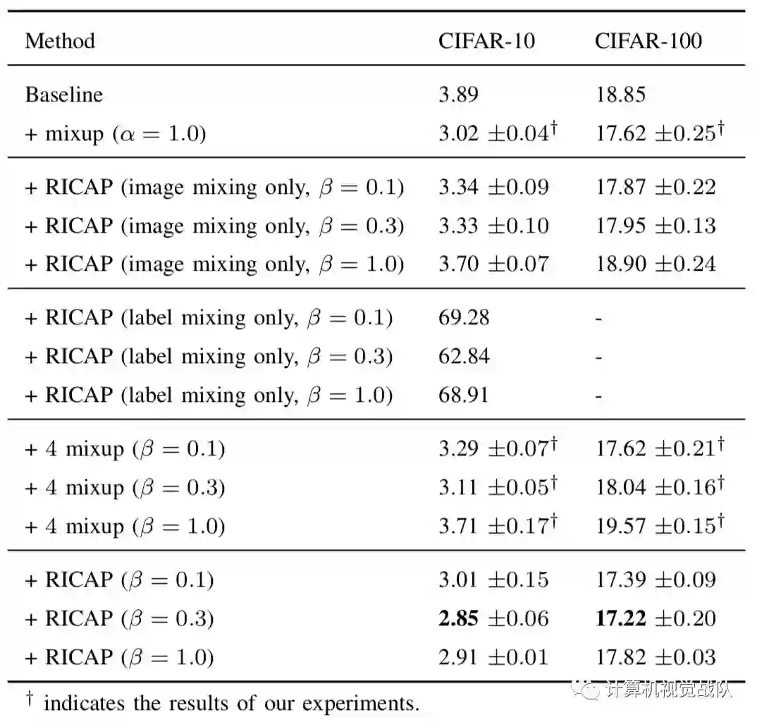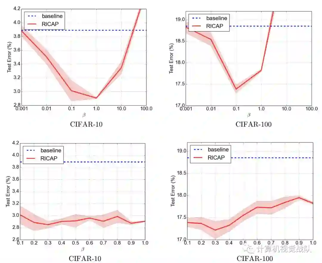 今天分享的文献中,提出了一种新的数据增强技术,称为随机图像剪切与修补(RICAP),用于深层卷积神经网络(CNN)。对RICAP的概念解释如下图所示。它包括三个数据操作步骤。首先,从训练集中随机选取四幅图像。第二,图像分别裁剪。第三,对裁剪后的图像进行修补以创建新的图像。尽管这一简单的程序,RICAP大幅度增加了图像的多样性,并防止了深度CNN具有许多参数的过拟合。四幅图像的类标签与图像面积成正比。这种标签混合工作在标签平滑,并防止无止境地追求hard 0和1的概率在深CNN使用Softmax函数。