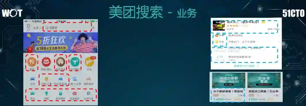 那么,美团搜索具体涉及到哪些方面呢?如上图所示,除了左图上方的首页搜索栏,其下方的各个业务频道里的搜索服务,也是由我们团队来负责的。