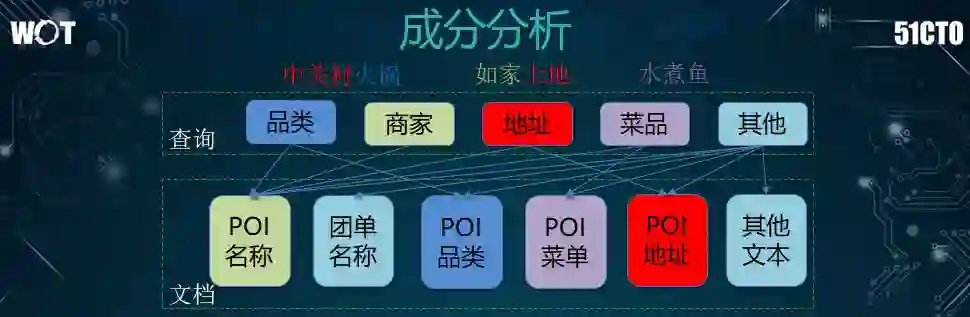 第二个方面是成分分析。考虑到用户可能会搜索各种短语,如:“中关村火锅”,其中,“中关村”是地址,“火锅”是品类,那么我们需要做好针对性的检索。