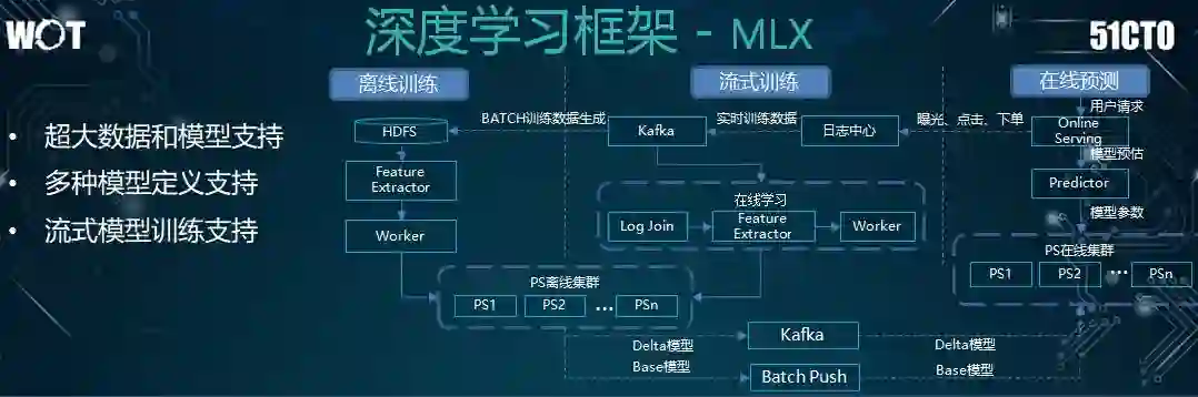 离线训练,即Base模型,是从日志数据表里提取特征,通过训练,将参数存到离线集群之中。