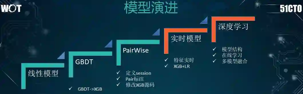 其中,模型层的演进过程是:线性模型→决策树模型(如 GBDT)→PairWise 模型→实时模型→深度学习,以满足个性化的特征。