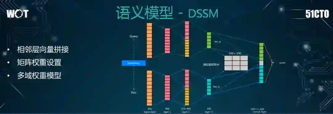 而在输出层,我们会更细腻地考虑两者之间的权重。我们会做一个相似度的矩阵,同时将这两个向量传递到最后的输出层,以线性加权的方式得到最终的分数,这便是我们在 DSSM 语义模型上的探索。