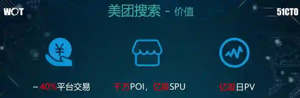目前,美团搜索覆盖了平台 40% 的交易,具有所谓千万级的 POI(Point of Interest,兴趣点)和亿级别的 SPU(Standard Product Unit,标准化产品单元),而且用户每天的搜索频次(即:日 PV),也能达到亿级。