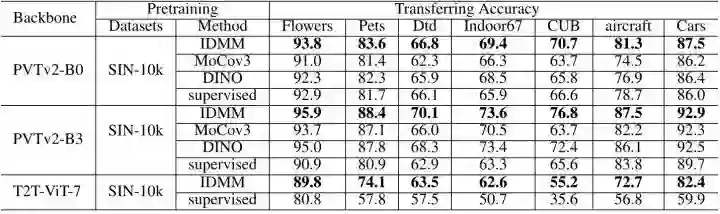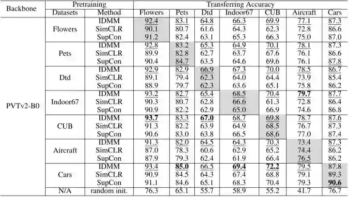 与 SimCLR 和 SupCon 相比,IDMM 在所有这些数据集上都具有更高的传输性能这可能要归功于可学习的全连接层 。