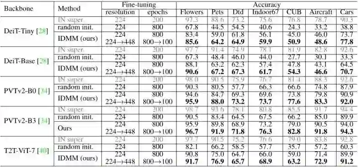 之后,作者又尝试了 Fine-tune 更长的 Epochs,以尝试获得更好的结果。之前的实验是在分辨率为224×224的情况下 Fine-tune 200 Epochs,现在改为在分辨率为224×224的情况下 Fine-tune 800 Epochs,并再在分辨率为448×448的情况下 Fine-tune 100 Epochs。结果如下图4所示。而且,IDMM 方法从头开始训练得到的性能和使用ImageNet 预训练模型的性能之间的差距已经大大缩小,这表明从头开始训练甚至对于 ViT 模型也是有希望的。