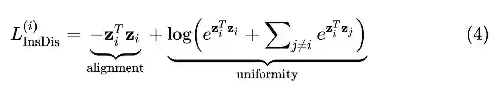 对比上式3和4不难发现都是有2项:alignment 和 uniformity,且结构相似。上式3和4的优化目标都是希望那些 positive pairs 之间的距离更接近些,negative pairs 之间的距离更远些。因此,作者得出结论,当设置 时,Instance discrimination Loss 近似等于 Contracstive learning Loss。