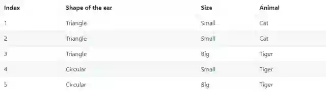 作为一个示例,这里假设将识别老虎分为 2 个特征,分别是耳朵的形状和体积大小,那么已知的数据可能是这样的: