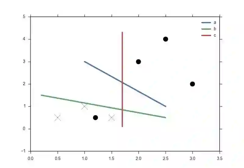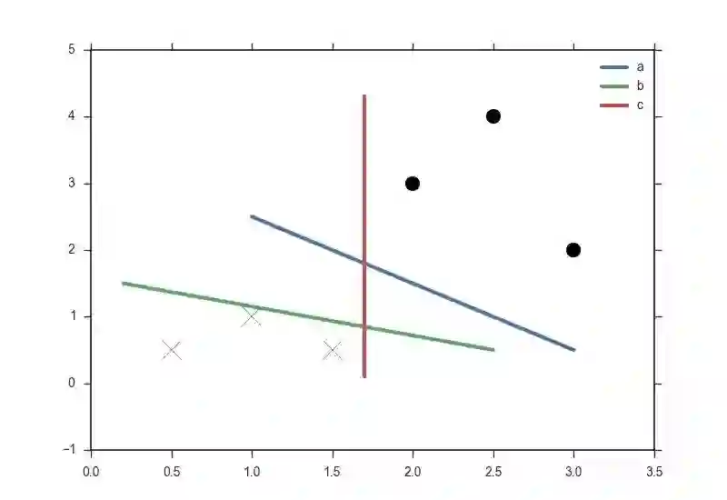 无论是a,b,c都无法完美地把两种数据区分出来,实际上也不存在一条直线能完全区分出两种数据,这种情况就是不可线性区分的,核函数或许可以帮我们解决这个问题。
