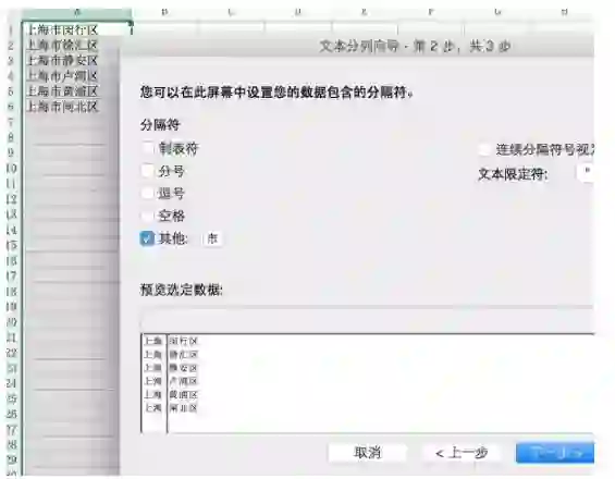 上文我有一列地区的数据,我想要将市和区分成两列。通常做法是可以用mid和find函数查找“市”截取字符。但最快做法就是用“市”分列。