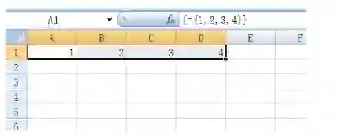 先看数组的最基础使用。选择A1:D1区域,输入={1,2,3,4}。记住是大括号。然后Ctrl+Shift+Enter。我们发现数组里的四个值被分别传到四个单元格中,这是数组的独有用法。