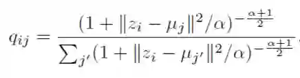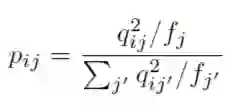 在得到特征表征之后,使用K-means方法初始化聚类中心,DEC设计了一种理想分布p,p分布的表达如下图:选择p分布主要为了强化高置信的部分以及规范化每个聚类中心的loss损失贡献,所以训练过程就是通过优化KL散度(Kullback-Leibler Divergence, KLD)不断优化p, q两个分布之间的差异的过程。