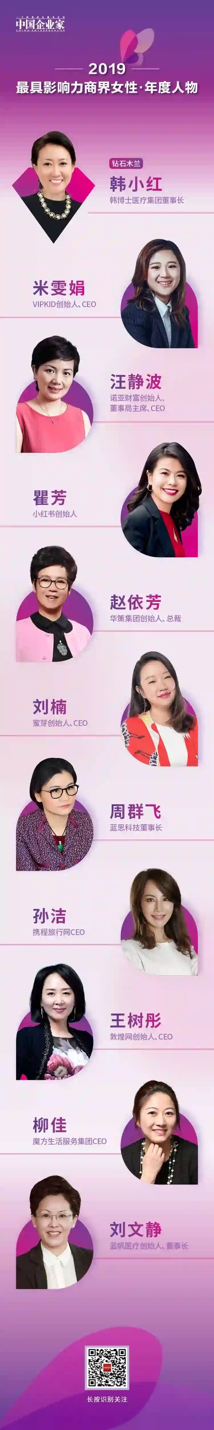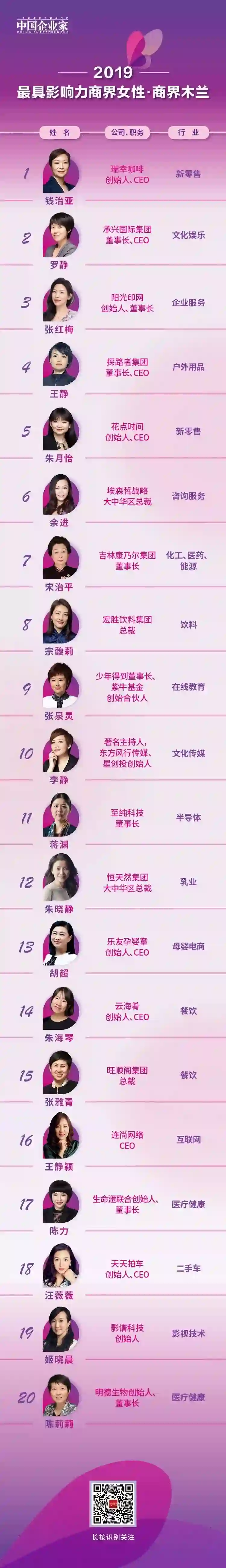 由《中国企业家》杂志社评选的“2019中国最具影响力的30位商界女性”榜单发布,这31位入选的女性企业家,在各自的行业领域里发挥了开创性的引领作用,并用她们的坚守、拼搏、柔韧和爱,让商业更加美好。