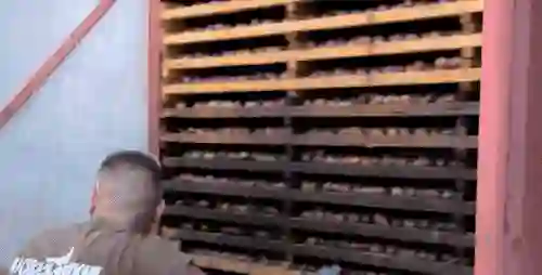 层层摞高,送去高温烘干 16 个小时,西梅的含水量就能从 80% 下降到 19% 了。