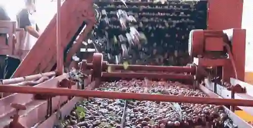 接着倒入清洗系统,在清洗果实的过程中,靠树叶和果实本身密度不同,用浮力去分离掉叶子。