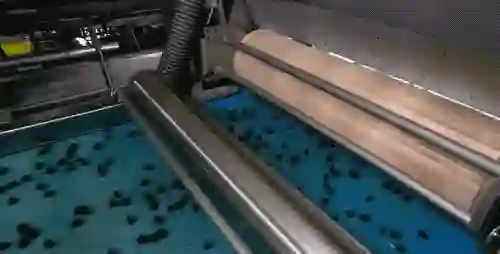 接着在运输中的托盘,上方有转动的浆片把西梅再给铺平。