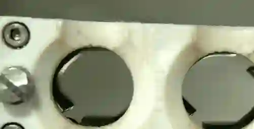 接着来一个小孔上方的视角:上面的去核刀具直接压下来,就把梅子的核捅下去了,在这一瞬间,梅肉还被夹在钳子上挤压着刀具呢。整个联动后,一配合起来,是十分迅速地一联排果核就去掉了。
