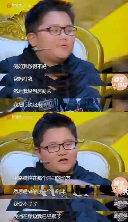 节目《放学别走》中小嘉宾朱子然说自己躲进房间,他妈妈也会追进来打,只能抵着门。
