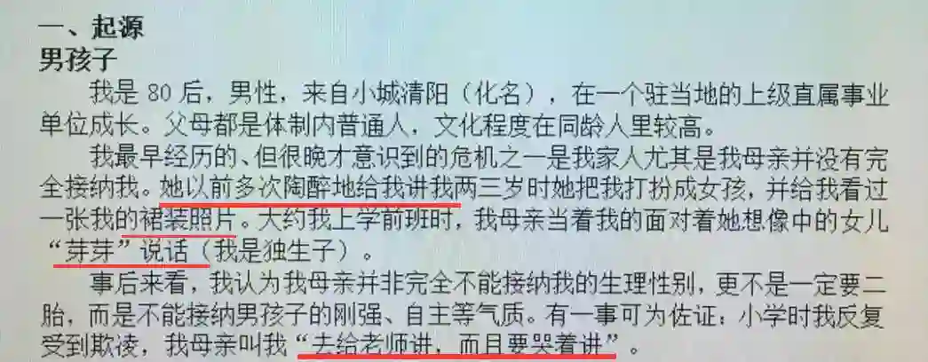 王猛的母亲一直不认可他的性别,因为她想要一个女儿。她甚至很陶醉地跟王猛说,在他两三岁的时候,总把他打扮成女孩,给他穿裙子,在他面前对自己想象中的女儿“芽芽”说话。