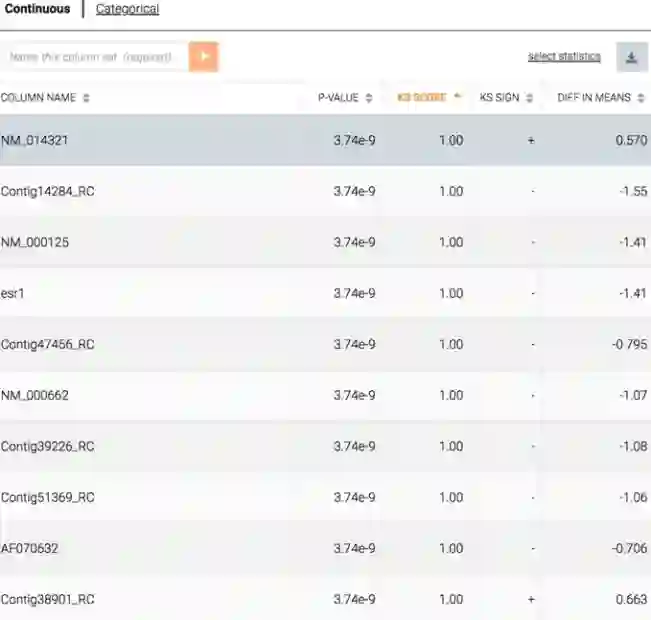 如果选择其中的两个子组,Ayasdi 技术允许研究者根据他们的 Kolmogorov-Smirnov 分数(KS 分数)生成特征列表。每个特征有两个分布——每个子组各有一个分布。KS 分数衡量两个子组之间的差异。与本结构相关的也就是标准统计意义上的 P 值。