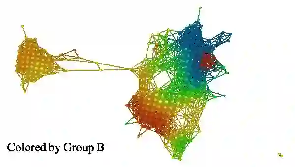 组 I 和组 II 的颜色明显不同。组 I 在 A 组中主要为红色,而在 B 组中主要为蓝色(小固相区域除外)。组 II 恰好相反,在 A 组中为蓝色,在 B 组中为红色。这些组可能与高雌激素受体表达有关,其中在组 I 中呈正相关,在组 II 中呈负相关。众所周知,雌激素受体表达是乳腺癌存活与否的「强信号」。如果我们比较所有三组(如下图):