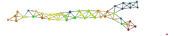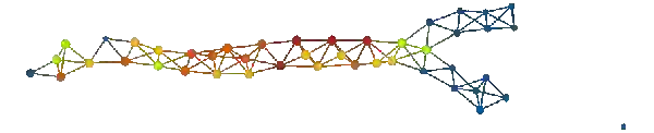 上图表明,拓扑模型包括一个很长的「树干」部分,然后分裂成两个「小枝」。在数据集中,存在一个名为 eventdeath 的二进制变量。如果患者在研究期间存活,则 eventdeath = 0;如果患者死亡则 eventdeath = 1。令人感兴趣的是,患者存活情况与图的结构相对应。一种方法是通过变量 eventdeath 的平均值进行着色。其结果如下所示。