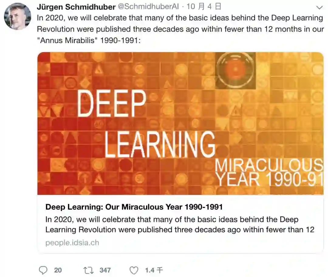 Jürgen Schmidhuber是LSTM 的发明人、著名深度学习专家。事情缘起于Jürgen上个月发表的一篇长文《Deep Learning: Our Miraculous Year 1990-1991》,他详细论述了近30年前,即1990~1991年之间他和团队进行的许多研究,并称这一年为“奇迹之年”。