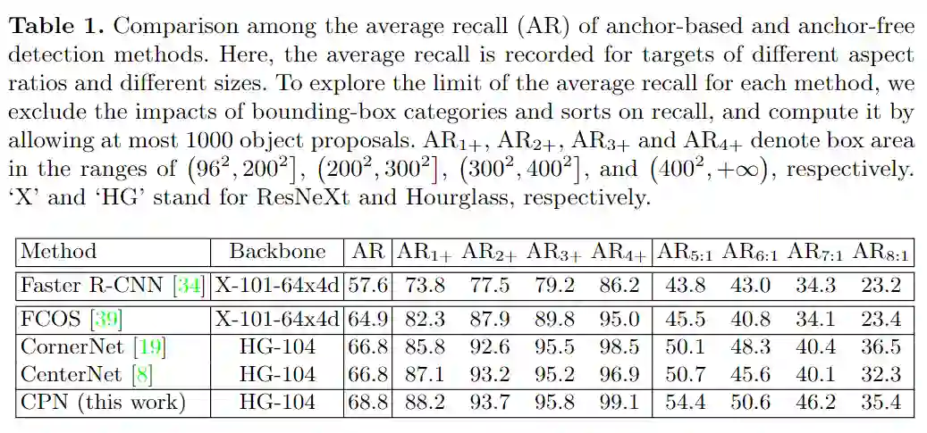 主要对四种object proposal提取方法进行了对比,并在MS-COCO验证数据集上进行了评估。结果显示,anchor-free方法通常具有更高的整体召回率,这主要是由于它们在两种情况下的优势:首先,当目标对象非常大,例如,大于4002像素时,基于anchor的方法Faster R-CNN将不会有更高的召回率。其次,当物体的长宽比变得特殊时,如5 : 1和8 : 1,Faster R-CNN的召回率非常低,在这种情况下,召回率明显低于CornerNet和CenterNet,因为没有预定义的anchor可以适应这些物体。在FCOS中也有类似的现象,FCOS是一种ancor-free的方法,它用一个关键点和到边界的距离来表示一个目标对象,但是当边界离中心很远时,FCOS通常很难预测一个准确的距离。而CornerNet和CenterNet方法将角点(和中心)关键点归为一个目标object,它们在某种程度上摆脱了这个麻烦。因此,本文的方法选择anchor方法,特别是点分组方法(CornerNet和CenterNet),以提高目标检测的召回率。同时,本文的CPN继承了CenterNet和CornerNet的优点,对物体的定位有更好的灵活性,尤其是形状奇特的物体。