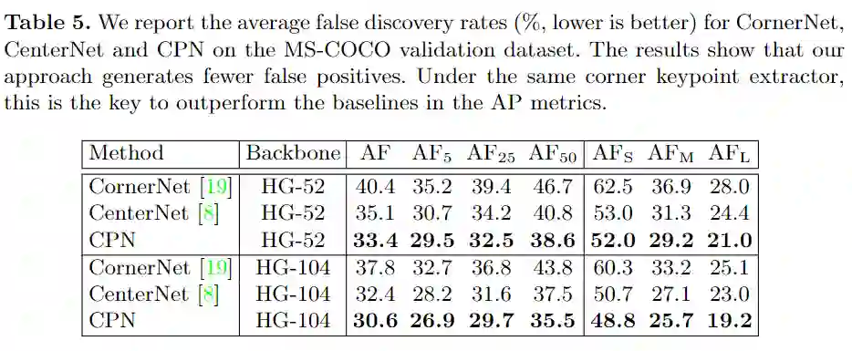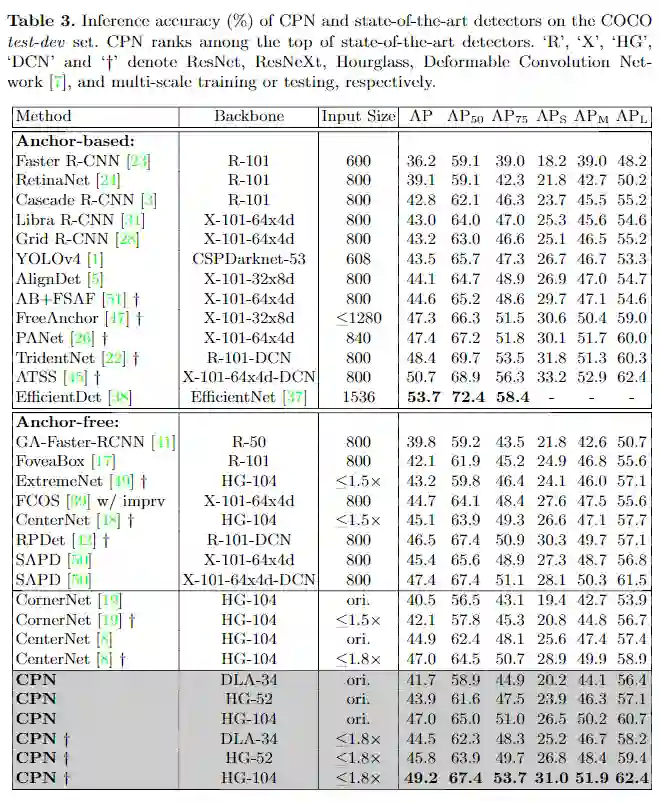 CPN的有效性已在MS-COCO数据集上得到验证,具体使用104层堆叠式Hourglass网络作为主干网络,CPN在COCO数据集上的AP为49.2%,比之前最好的anchor-free目标检测算法CenterNet 高2.2%。尤其,CPN在检测具有特殊形状(例如很大或很小的面积或极高长宽比)的物体时具有更高的精度增益,这证明了使用anchor-free方法进行proposals提取的优势。同时,CPN使用较轻的主干网络DLA-34 并在推理环节不使用图像翻转数据增强策略时,在26.2 FPS时可达到41.6% AP,在43.3FPS时达到39.7% AP,在相同的推理速度是,性能超过了大多数的目标检测算法。