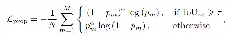 分类方法第一步:训练一个二进制分类器,以确定每个proposal是否是一个目标对象。为此,首先采用卷积核大小为7×7的RoIAlign 来提取每个proposal上的box特征(见图2)。然后使用一个32×7×7的卷积层以获得每个proposal的分类分数。基于此,构建了一个二进制分类器,损失函数为: