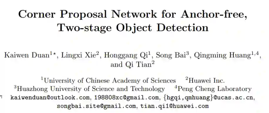 通常,目标检测算法的目标是确定图像中目标对象的类别和位置。本文提出了一种新颖的anchor-free两阶段框架,该框架首先通过查找可能的角点关键点组合来提取多个候选目标object proposals,然后通过独立的分类阶段为每个候选object分配一个类别标签。实验证明了这两个阶段分别是提高召回率和准确率的有效解决方案,同时这两个阶段可以集成到端到端网络中。本文的方法被称为“Corner Proposal Network (CPN)”,它具有检测各种scales尺度的目标的能力,并且还避免了被大量false-positive proposals所混淆。在MS-COCO数据集上,CPN的AP达到49.2%,在最新的目标检测方法中具有一定的竞争力。同样,CPN在AP达到41.6%/ 39.7%时有26.2 / 43.3FPS,推理速度性能同样出色。