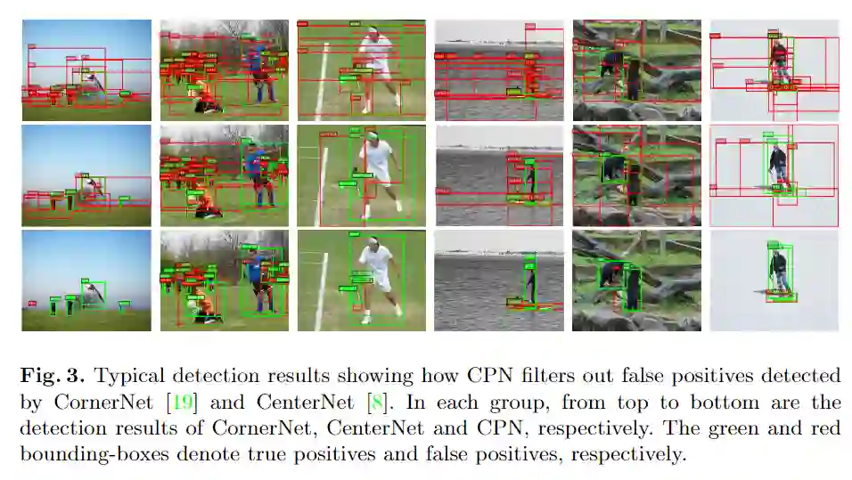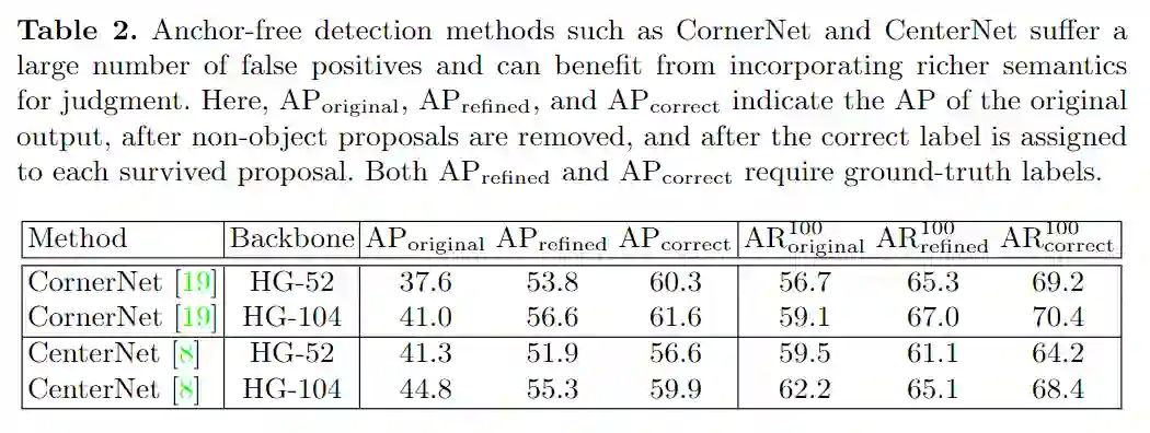 以具有高召回率的CornerNet和CenterNet为例。如表2所示,具有52层和104层Hourglass 网络的CornerNet在MS-COCO验证数据集上实现了37.6%和41.0%的AP,而很多检测到的 "目标 "都是假阳性false positives。无论是当删除object proposal,还是给每个预备的object proposal分配一个正确的标签,检测精度都会显著上升。这个结果在CenterNet上也是成立的,它增加了一个中心点来过滤掉假阳性样本,但显然没有把它们全部删除。为了进一步缓解这个问题,本文的方法需要继承两阶段方法的优点,即提取proposal内的特征,并训练一个分类器来过滤掉假阳性样本。