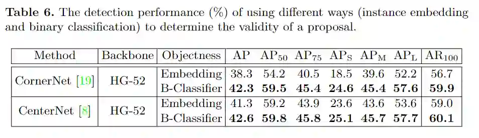 尽管本文的方法基于CornerNet来提取object proposal,但是确定目标对象及其类别等后续机制却大不相同。CornerNet通过将关键点投射到一维空间来生成目标对象,并将紧密嵌入的关键点分组到同一实例中。我们认为,embedding 过程虽然在不使用额外计算的假设下是必要的,但在配对关键点时可能会产生重大错误。特别是,不能保证embedding 函数(给每个目标对象分配一个数字)是可学习的,更重要的是,损失函数只在每个训练图像中起作用,以迫使不同目标对象的embedding number被分离,但这种机制往往不能通用于看不见的场景,例如,即使多个训练图像简单地连在一起,在单独的图像上工作良好的embedding 函数也会急剧失效。不同的是,本文的方法使用单独的分类器确定目标对象实例,从而充分利用内部特征来提高准确性。