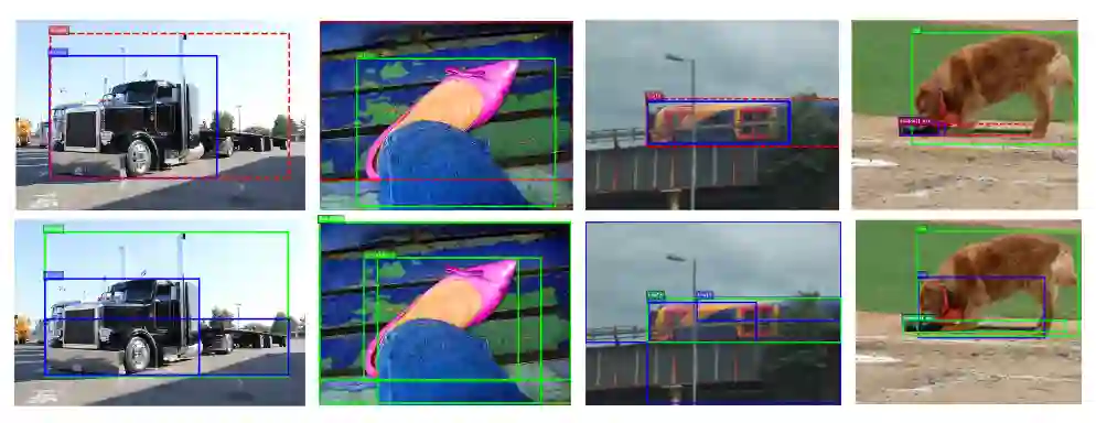 图1.现有物体检测方法的典型错误。第一行:基于anchor锚的方法(如Faster R-CNN)可能难以找到具有特殊形状的物体(如尺寸非常大或长宽比极端的物体)。第二行:anchor-free方法(如CornerNet)可能会错误地将不相关的关键点归入一个物体。绿色、蓝色和红色边界框分别表示真阳性、假阳性和假阴性。