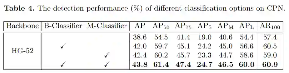 由于关键点热图的高分辨率和灵活的关键点分组机制,检测到的目标对象可以具有任意形状,并且召回率上限大大提高。但是,这种策略增加了proposal的数量,因此带来了两个问题:大量的误报以及过滤掉它们的计算成本。为解决此问题,第二阶段设计了一种有效的两步分类方法,该方法首先使用轻量级二进制分类器删除80%的proposal,然后应用细分类器确定每个幸存proposal的分类标签。