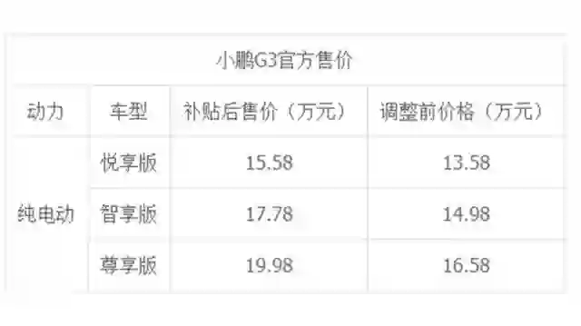 2月1日消息,据报道,小鹏官方透露,自2019年2月1日起,小鹏G3全系正式调整补贴后售价。新车共推3款车型,补贴后统一售价区间为15.58-19.98万元,调整后增加幅度为2.00-3.40万元 ,具体详情请见下表。