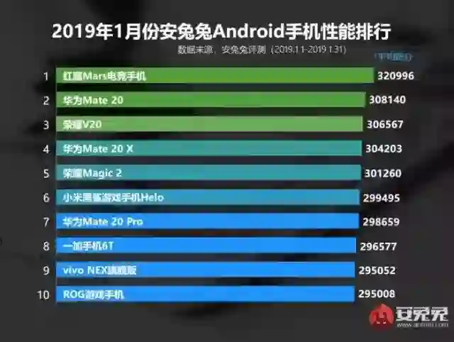 2月1日,安兔兔根据后台统计的数据,公布了2019年1月份国内Android手机性能榜单。本月红魔Mars电竞手机继续位列第一名,平均成绩为320996,和上月基本持平。排名2-5位的则是搭载麒麟980处理器的四兄弟,依次是Mate 20、荣耀V20、Mate 20 X以及荣耀Magic 2,四者的平均成绩都在30-31万之间。但遗憾的是,Mate 20 Pro的平均成绩居然低于30万,而且被黑鲨游戏手机Helo反超,位居第七名。8-10名依次是一加手机6T、vivo NEX旗舰版以及ROG游戏手机,平均成绩也都超过了29.5万。