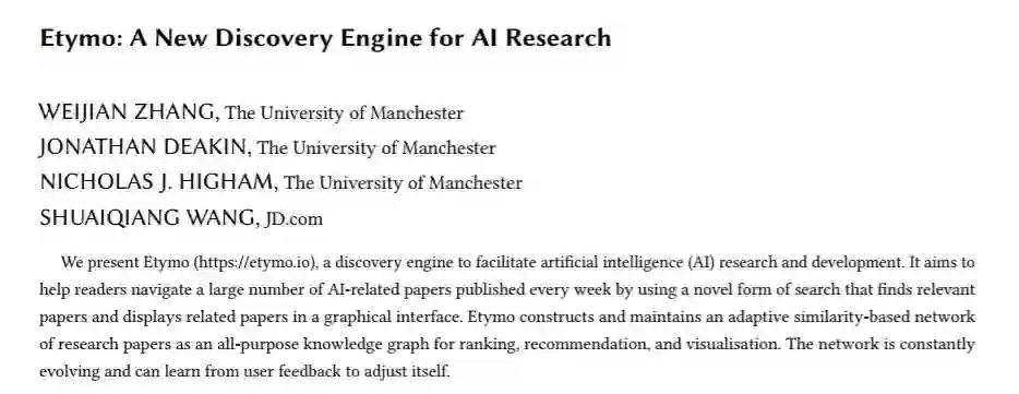 全球科研产出的快速增长给信息检索带来了新的挑战。这个问题在 AI 研究领域尤为严重。例如在 arXiv (https://arxiv.og) 上,每周大约有 500 篇与 AI 相关的新论文出现。新论文的激增使研究人员很难跟进 AI 领域最新的进展。为了应对这一挑战,作者开发了 Etymo,一个面向学术搜索的全新发现引擎。