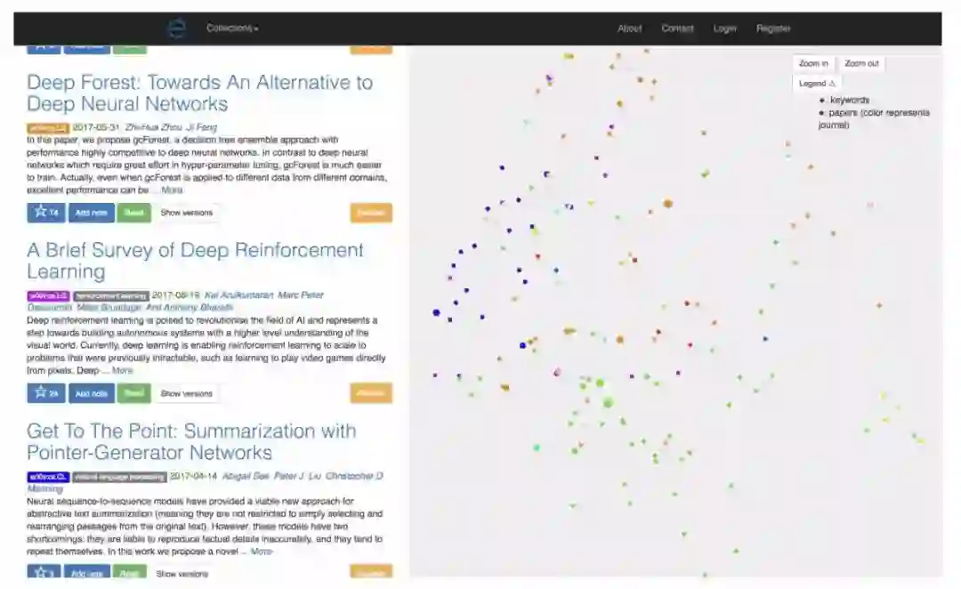 首先,Etymo 利用文档的向量表示来构建基于相似性的网络,在网络中论文作为节点,相似的论文互相连接。网络是自适应的,通过用户反馈机制:用户评分、点击以及 Twitter 转发次数来强化“正确的”连接,弱化“不重要的”连接。得到的网络随后用于排序和推荐。其次,作者设计了一个新的搜索界面,搜索结果不只通过传统的项目列表显示,还有反映论文之间关系的可视化图,以帮助读者快速找到相关论文,并对研究领域有一个整体的了解。