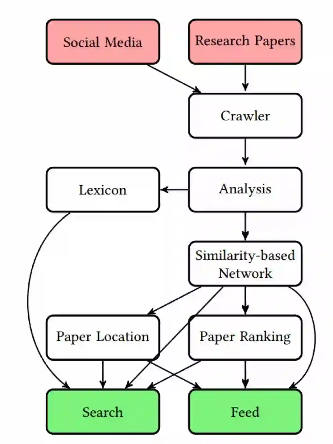 在分析(Analysis)阶段,首先用 pdftotext 将 PDF 全文转换成文本,然后用 Doc2Vec 算法和 TF-IDF 算法将文档 d 表示为一个数学向量。内容类似的论文在向量空间中距离相近。该内容相似性信息随后被用于构建针对数据库中所有论文的基于相似性的网络(Similarity-based Network)。作者用这两种算法分别构建了两个网络,实验证明两个网络的结合具有最好的效果。作者使用 t-SNE 来确定论文位置(Paper Location),利用网络中心性算法对论文排序(Paper Ranking),一篇论文在网络中的节点度(和该节点相关联的边的条数)越高,该论文就越重要。TF-IDF 的全局词条权重生成了一个词库(Lexicon),随后应用于搜索中。Etymo 主要由一个搜索引擎(Search)和一个反馈引擎(Feed)构成,两个引擎的结果分别显示成列表和图示。