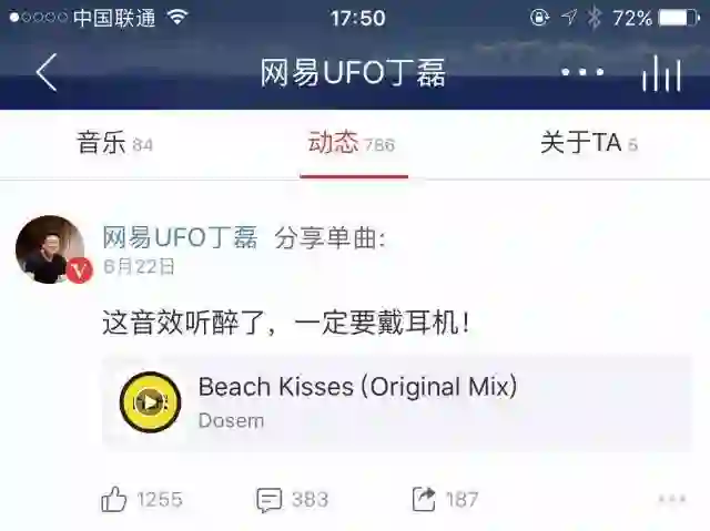 就在前一天,丁磊以普通用户的身份在网易云音乐上推荐了歌手Dosem的纯音乐作品Beach Kisses,获得了1255个赞,这首歌现在已有383条评论。