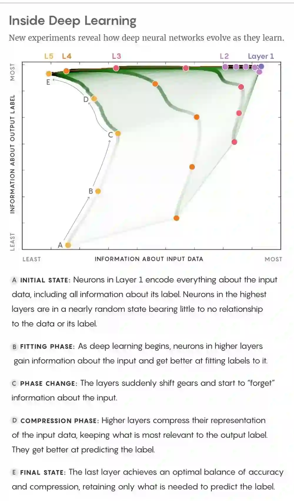 尽管这一隐藏在深度神经网络后面的概念已经讨论了几十年,但是它们在语音识别、图像识别等任务中的表现在 2010 年代才出现较大的发展,这和优化的训练机制、更强大的计算机处理器息息相关。2014 年,Tishby 阅读了物理学家 David Schwab 和 Pankaj Mehta 的论文《An exact mapping between the Variational Renormalization Group and Deep Learning》(变分重整化和深度学习之间的映射关系),认识到他们与信息瓶颈原则的潜在联系。