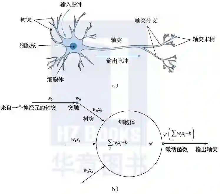 神经网络是一类典型的非线性模型,它的设计受到生物神经网络的启发。人们通过对大脑生物机理的研究,发现其基本单元是神经元,每个神经元通过树突从上游的神经元那里获取输入信号,经过自身的加工处理后,再通过轴突将输出信号传递给下游的神经元。当神经元的输入信号总和达到一定强度时,就会激活一个输出信号,否则就没有输出信号(如图2.7a所示)。