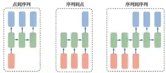 循环神经网络可以对时间序列进行有效建模,根据它所处理的序列的不同情况,可以把循环神经网络的应用场景分为点到序列、序列到点和序列到序列等类型(如图2.18所示)。