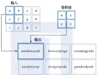 图2.10描述了一个2×2的卷积核将输入图像进行卷积的例子。所谓卷积就是卷积核的各个参数和图像中空间位置对应的像素值进行点乘再求和。经过了卷积操作之后,会得到一个和原图像类似大小的新图层,其中的每个点都是卷积核在某空间局部区域的作用结果(可能对应于提取图像的边缘或抽取更加高级的语义信息)。我们通常称这个新图层为特征映射(feature map)。对于一幅图像,可以在一个卷积层里使用多个不同的卷积核,从而形成多维的特征映射;还可以把多个卷积层级联起来,不断抽取越来越复杂的语义信息。